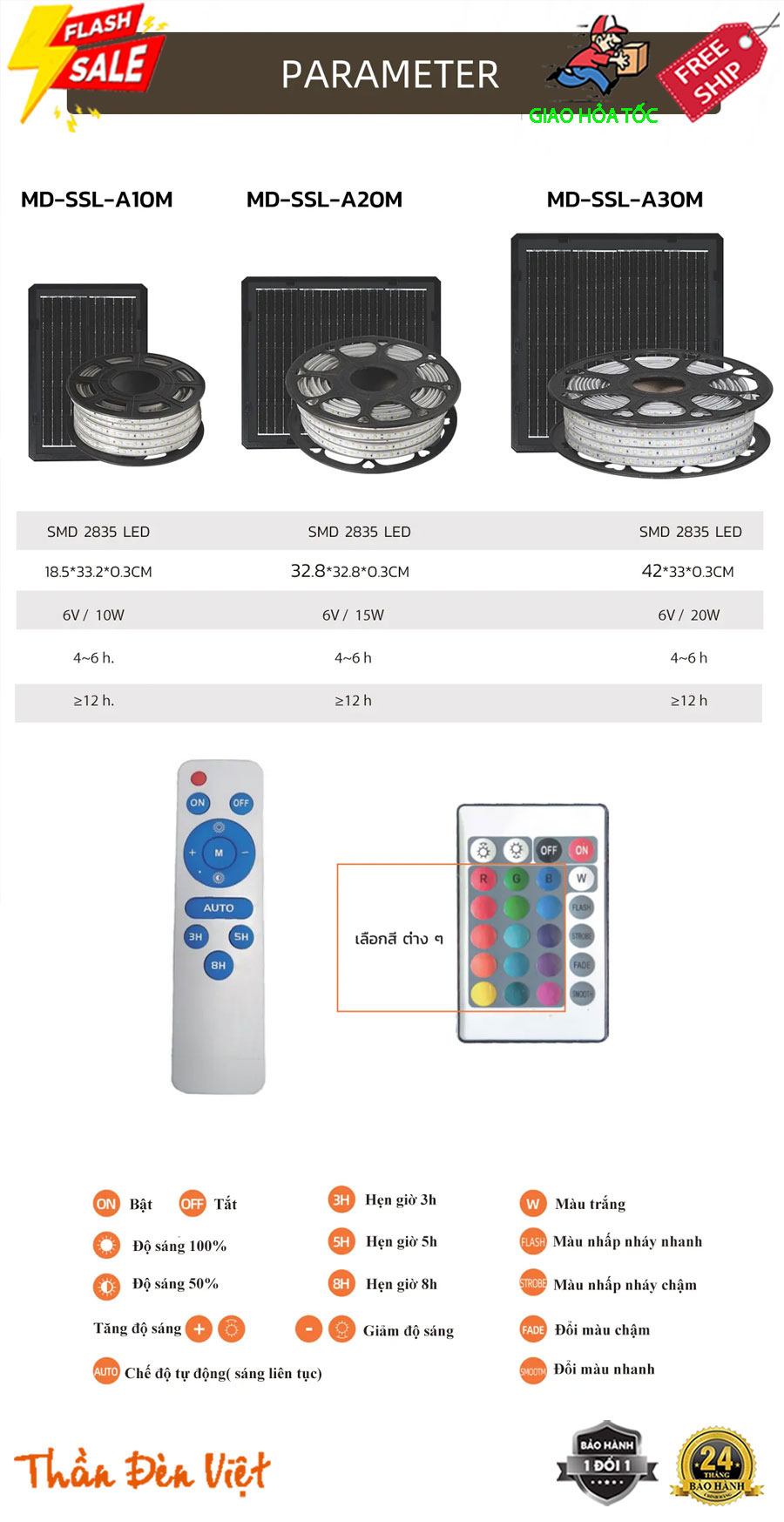 - Để khẳng định chất lượng tuyệt vời của sản phẩm và trân trọng sự hài lòng của khách hàng, Thần Đèn Việt cam kết bảo hành miễn phí 2 năm trọn bộ sản phẩm bao gồm cả linh phụ kiện. Trong vòng 1 năm đầu tiên, nếu sản phẩm gặp bất kỳ lỗi kỹ thuật nào, Quý khách có thể yêu cầu đổi mới sản phẩm hoàn toàn miễn phí.
