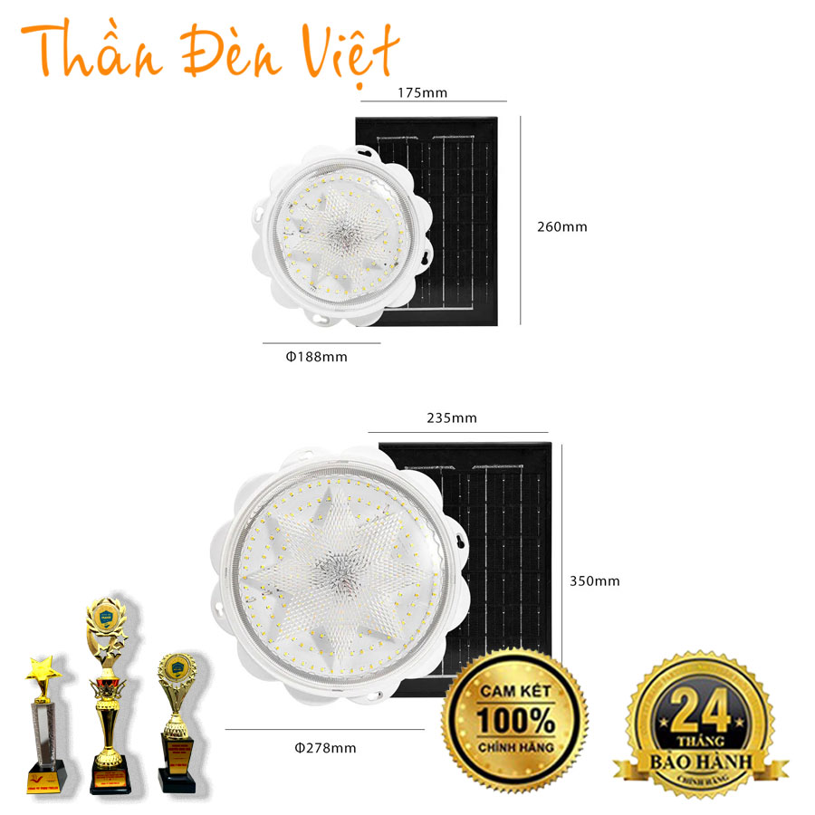 - Kích thước: đèn Φ188x60mm, tấm pin: 175x260x15mm